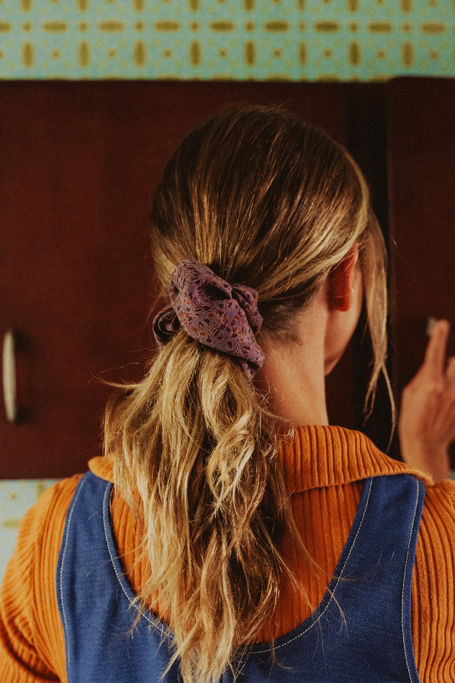 Ce chouchou fabriqué avec des stocks de tissu vintage se porte aussi bien dans les cheveux qu'autour du poignet.