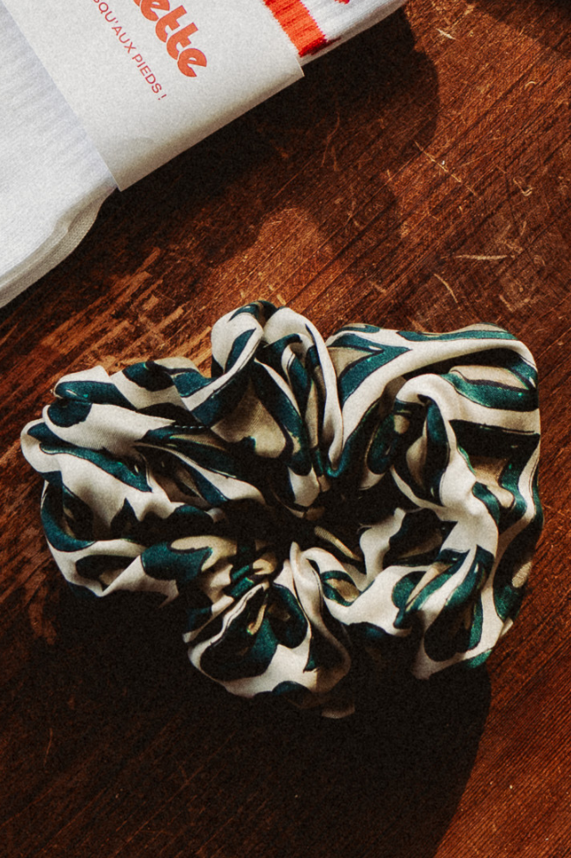 Ce chouchou fabriqué avec des stocks de tissu vintage se porte aussi bien dans les cheveux qu'autour du poignet.